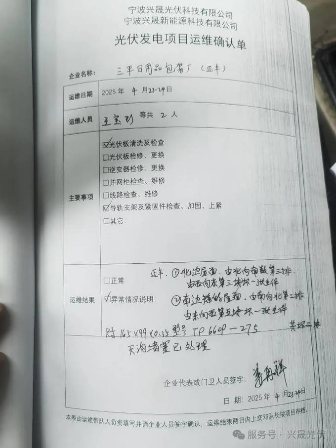 “運維無小事”是興晟團隊的核心準則。每一次現場作業均嚴格執行“登記-操作-驗收”流程,并通過企業簽字確認,確保責任可追溯。在余姚某商業屋頂項目中,運維人員發現組件因不明物體產生斑點,立即啟動應急預案,48小時內完成更換,全程透明化溝通,贏得客戶高度認可。